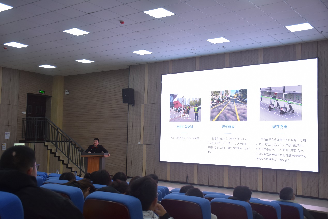 宣讲会上,代祥社处长以专业的视角和丰富的经验为师生讲解校园电动车规范管理工作的具体内容,同时就校园为什么要规范管理电动车作了详细解释:校内摩托车、电瓶车及机动车数量激增,飙车、超速行驶等危险驾驶的行为频发,严重威胁着全体师生的生命财产安全。为保证一个安全文明的校园,创造和谐美丽的校园,给广大学子一个舒适的学习环境,学校出台规范管理电动车的文件和方案刻不容缓。