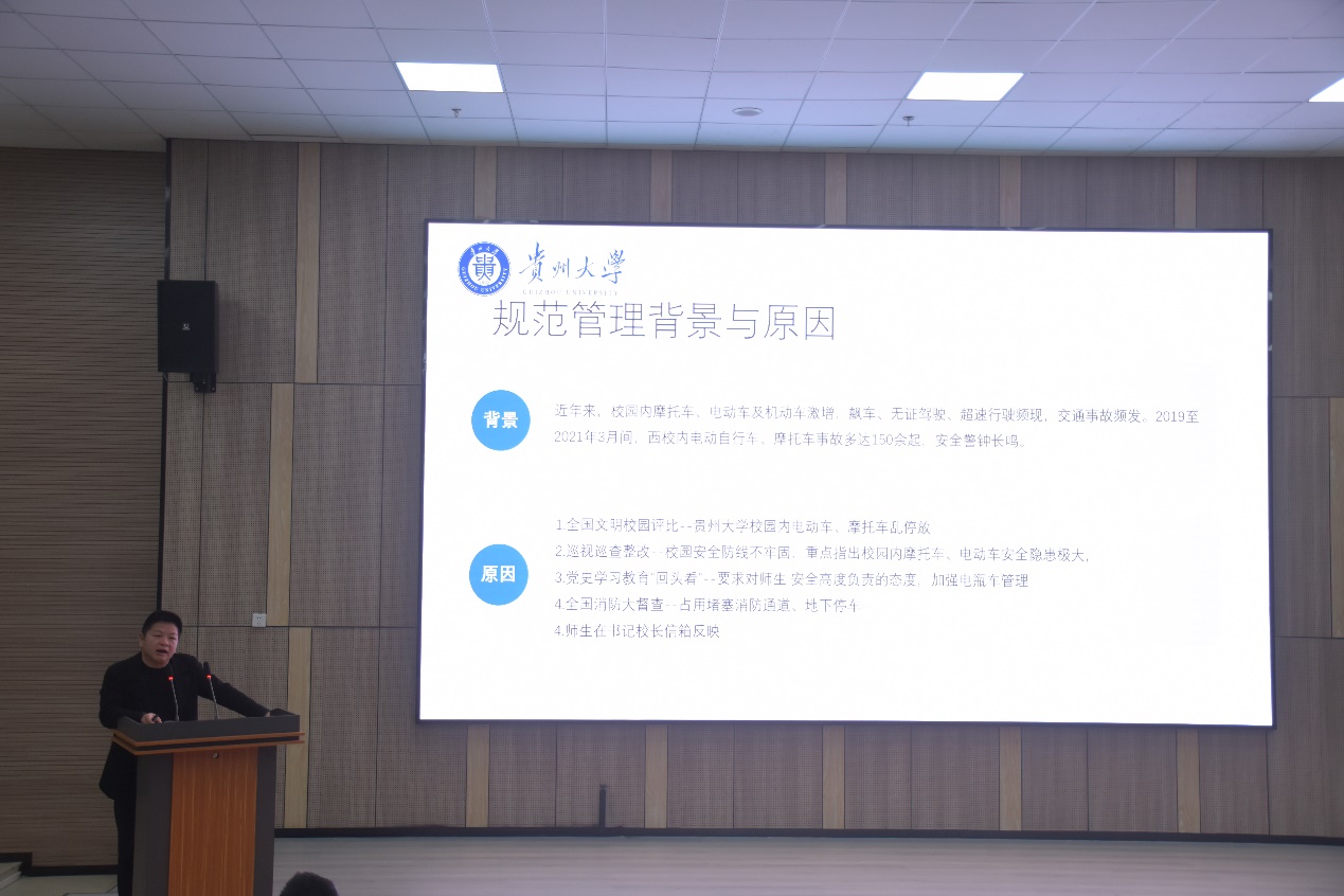 紧接着,代祥社处长对校园的电动车规范管理措施及其效果作了说明。在实行交通时段管制、规范停放充电、摩托车禁行、发放校园通行证等规范措施的基础上,学校有关电动车的安全问题在一定程度上得到缓解,促进了学校交通安全建设。电动车规范管理只是一个过程,最终目标是打造一个安全、有序、和谐的校园环境,让师生都能安心出行。同时,代祥社处长也呼吁师生积极响应、主动配合、齐心协力维护校园交通安全。